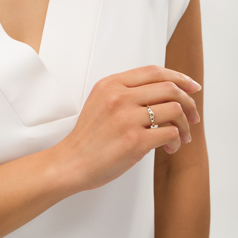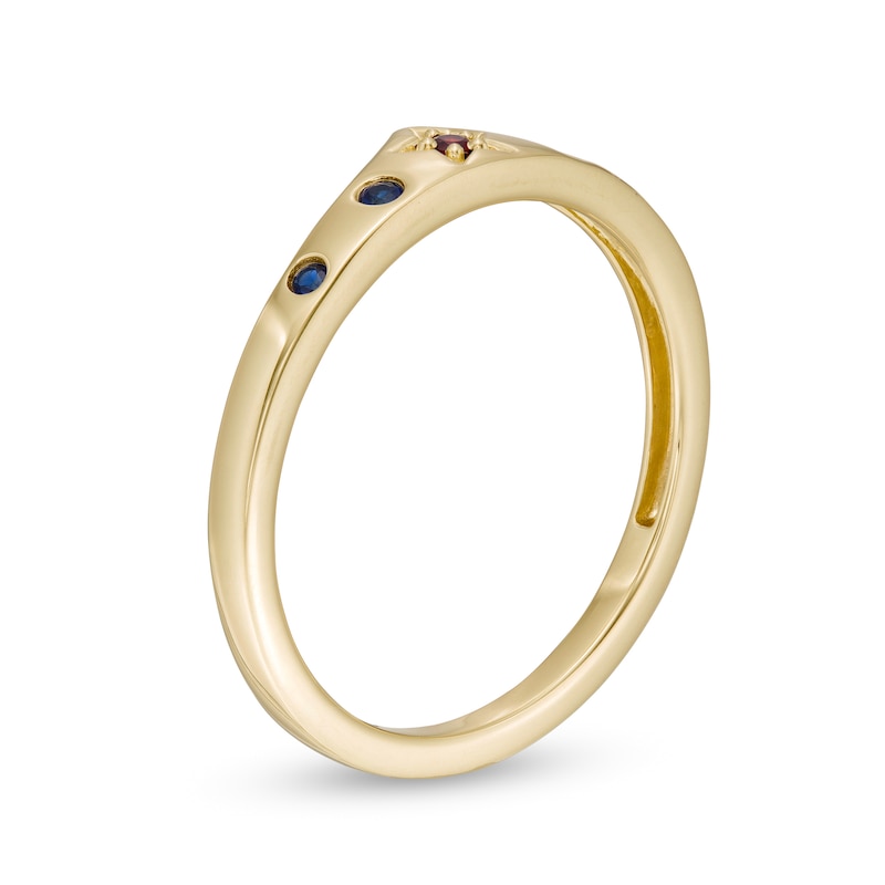 Crafted in warm 10K gold, this classic style is topped with a royal red star centered with a garnet. Bright blue sapphires set along the band add an eye-catching pop of color. Polished to a dazzling shine, this ring is a subtle reminder of your confidence and character.
